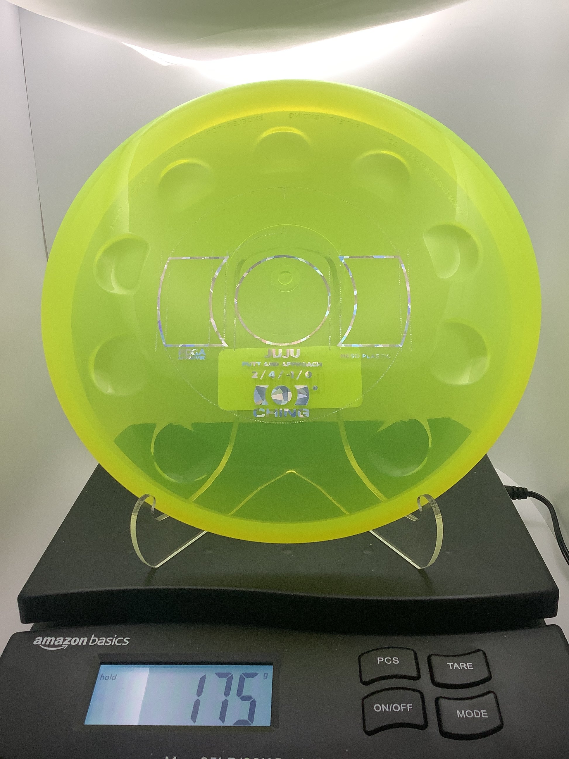 The Ching Juju features excelerator contours (grooves) on top of the disc to provide a better grip. When thrown, it has a neutral to understable flight.