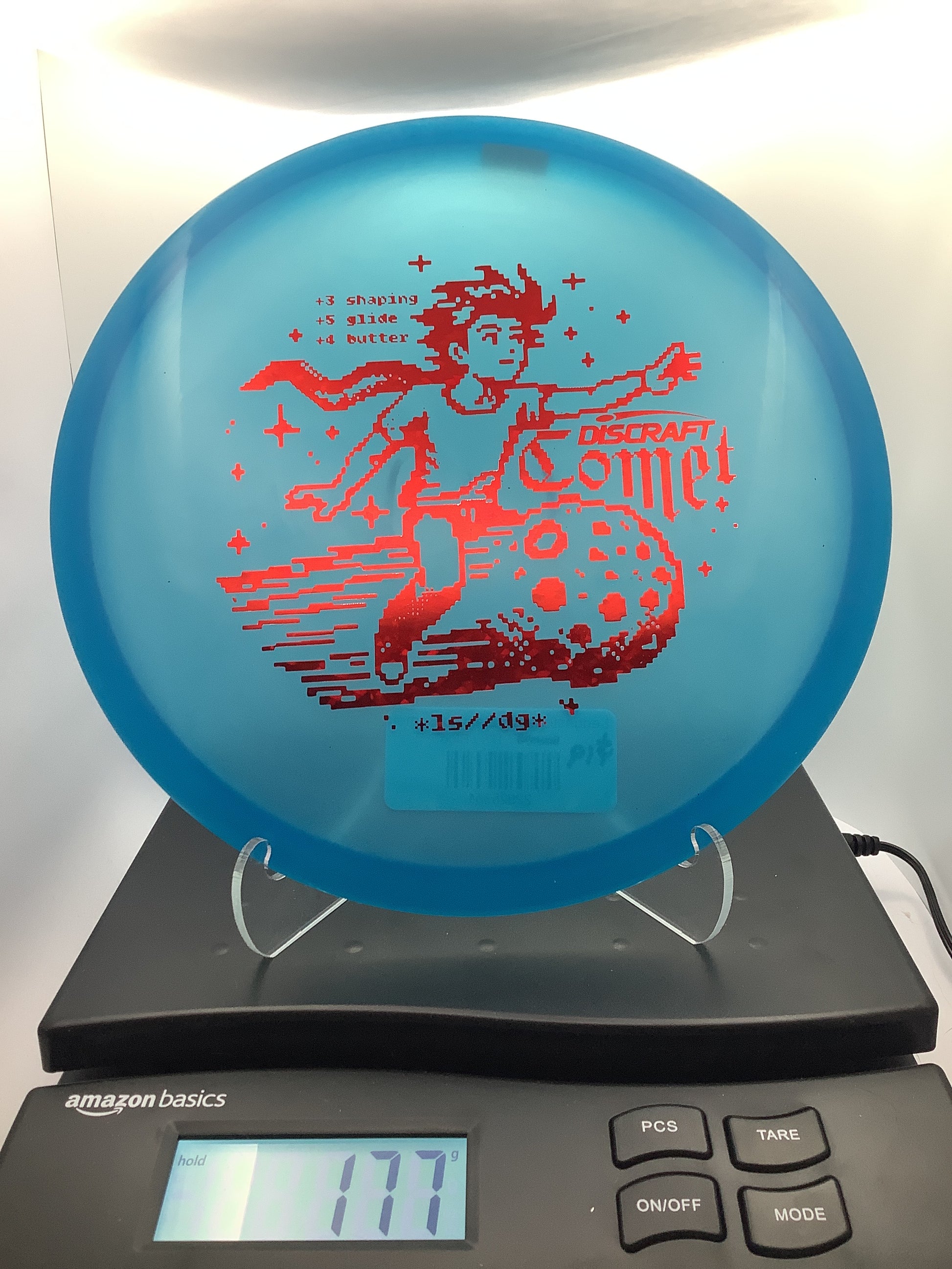 The Comet is understable with supreme glide, but the intended flight of the Comet can be achieved even at very slow arm speeds, making this a popular disc for all skill types. Straight shots, hyzer-flips, soft hyzers, massive turnovers; this disc can do it all. These Comets are more overstable than normal with high durability, making them a run players will want to get their hands on. They glow in the dark as well, making the pixel art stamp design stand out as an unnamed anime character rides through the sky on a fiery comet.