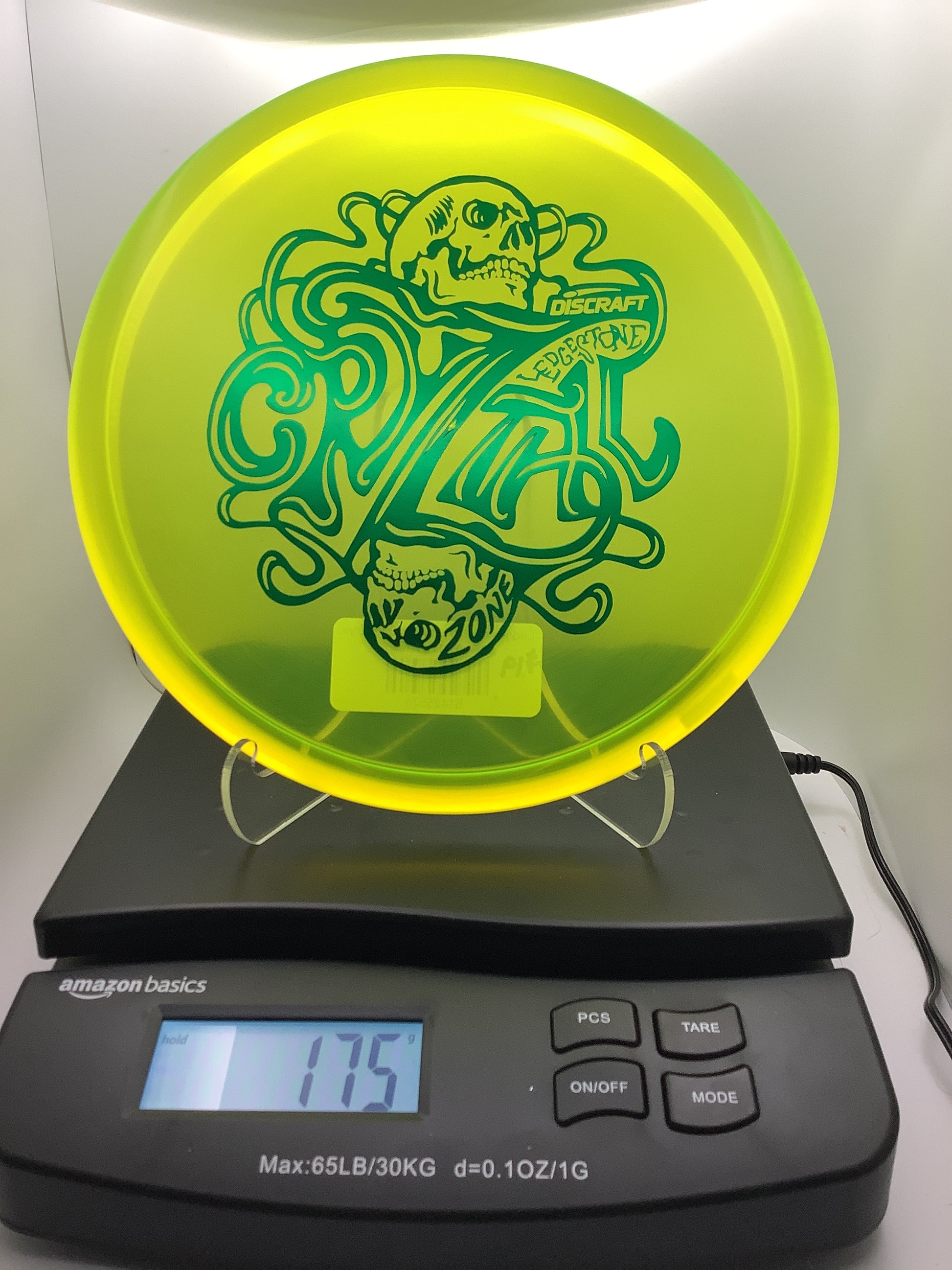 The Zone is Discraft’s most popular approach disc. Good for both forehands and backhands, this extremely overstable mold can handle significant torque and always provides a reliable finish to its flight, no matter the angle. This run is beefy and consistent with a smooth grip. Skulls and smoke spell out an elaborate and creative “CRYZTAL” across the face of these Zones.